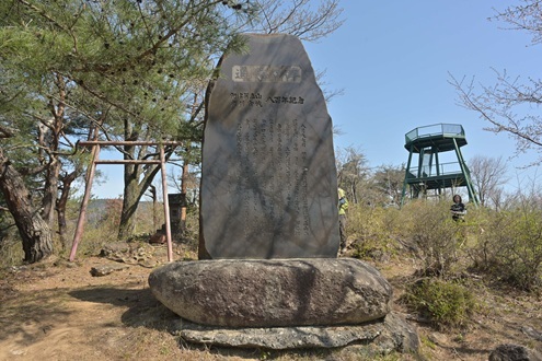 ▼山頂部には阿津賀志山奥州合戦八百年の石碑が置かれている