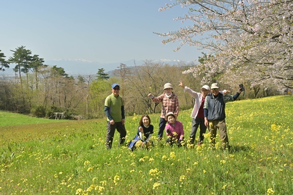 ▼山頂部から下降の途中桜と菜の花のコラボの中で吾妻山と安達太良を背に(^^♪