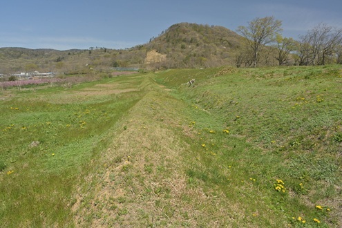 ▼国史跡の二十堀と土塁からなる防塁越しに阿津賀志山を見上げる