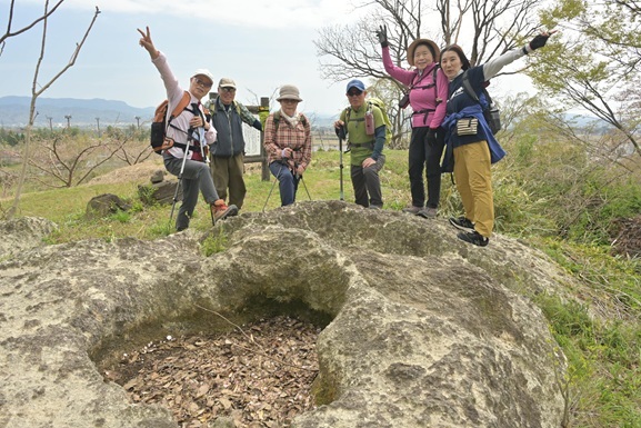 ▼丘の山頂にある弁慶の硯石と言われる岩を囲んで(^^♪