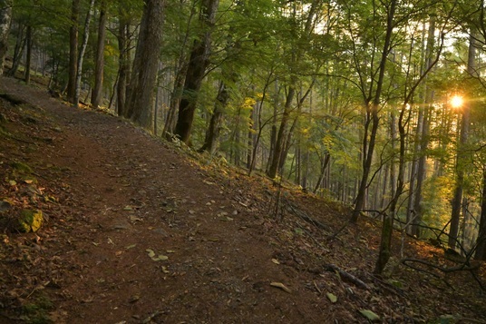 ▼峠へと登る道すがら林へと差し込む黄金色の陽光が美しい