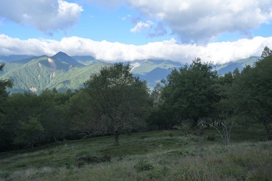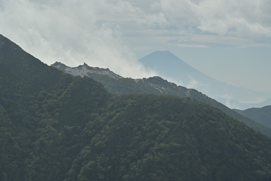 ▼夜叉神峠小屋前に出ると緩やかな尾根路となり見晴らしが得られる