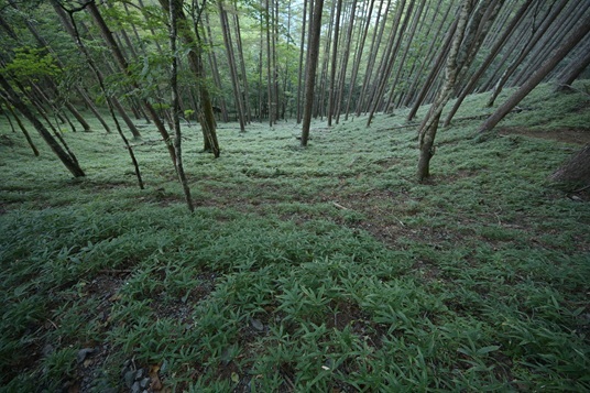 ▼尾根の側面は急なカラマツ林で林床は背丈の低いササが埋めていた