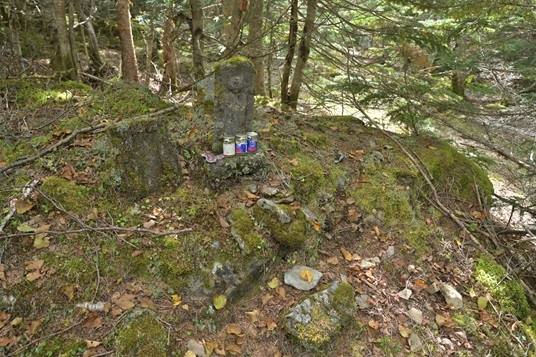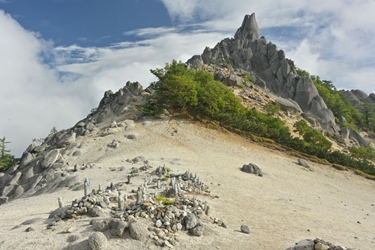 ▼地蔵岳と赤抜沢ノ頭の間に開けた賽の河原から見上げたオベリスク