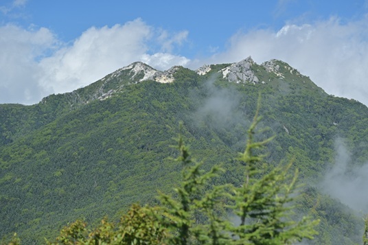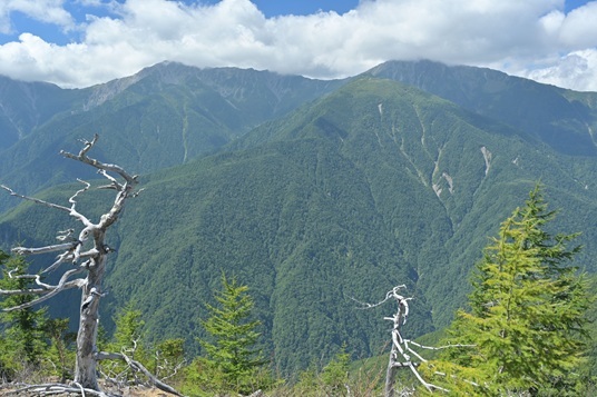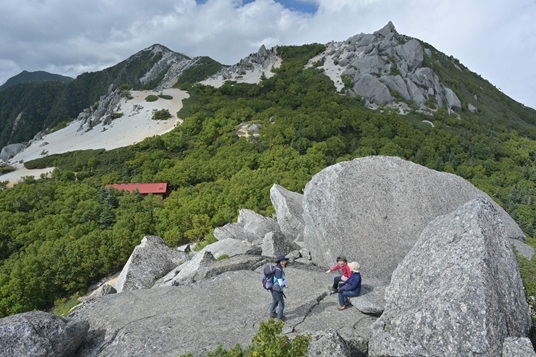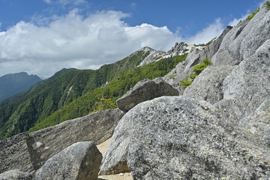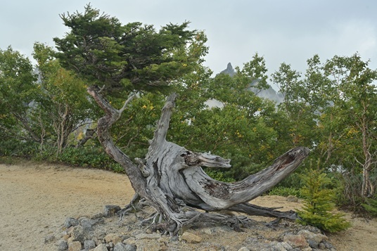 ▼乾いた感じの花崗岩の稜線に生きるカラマツがオブジェと化した姿を見せている