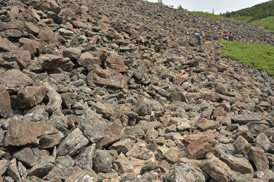 ▼樹林の合間に現れる岩くずを敷き詰めた広い石野原
