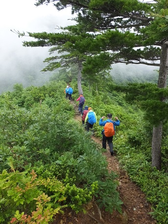 ▼急登の途中から飯豊の残雪が望めた「まさかこの雨では見えない」