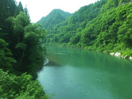 ▼川の上流には「越後三山」が望める(^^♪ 1泊目はここ小出だ!!