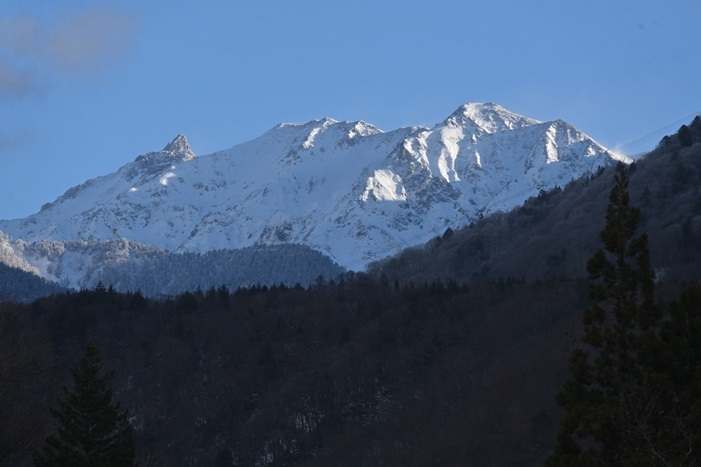 ▼昨年お夏に踏んだ乗鞍岳が白く輝いていた