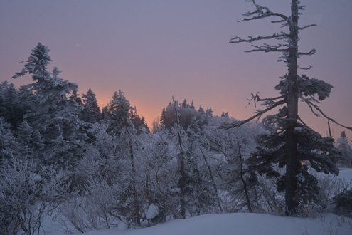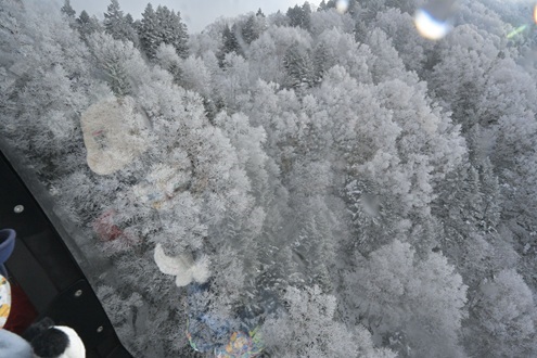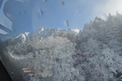 ▼ゴンドラの窓から見る樹林には霧氷の森となっていた(^_-)-☆