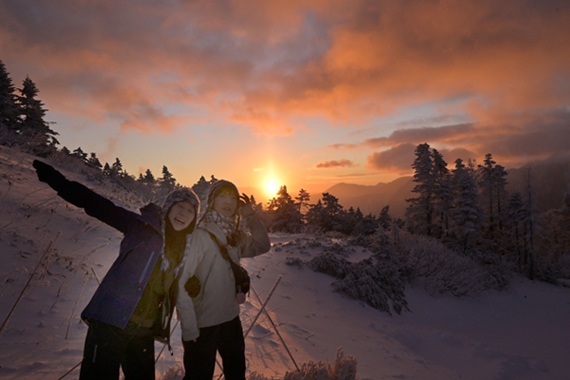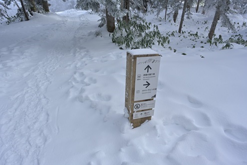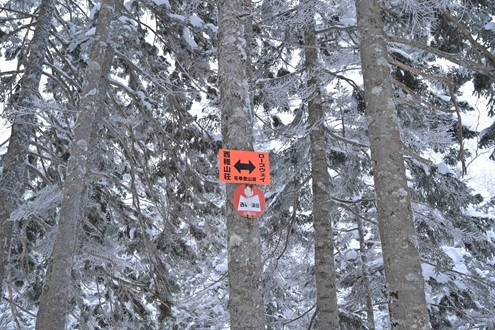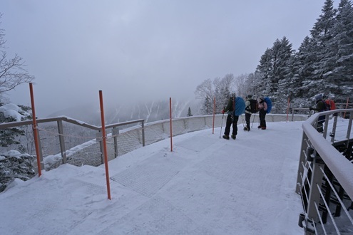 ▼山頂駅でアイゼンを装着し今は雪一色の千石平園地へと歩き出す