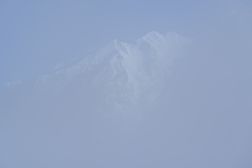 ▼展望地からガスの中に薄っすら浮かび上がった西穂高岳あとは濃いガスに視界は