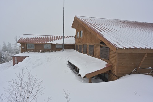 ▼国師ヶ原に立つ無人避難小屋の高原ヒュッテにてランチタイムとした