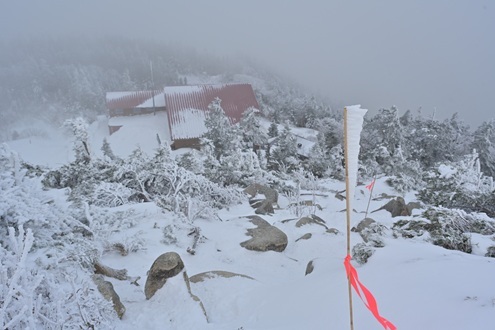 ▼ロープウェイの一番に間に合わせるべく山荘を発ち視界のない中下降する