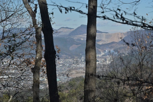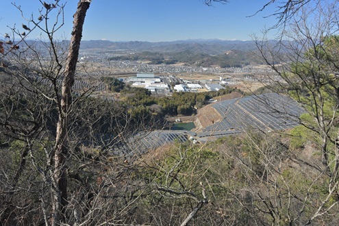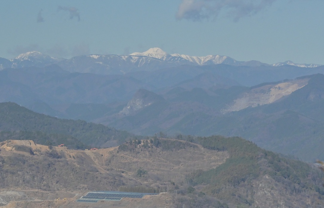 ▼諏訪岳への尾根途中から見た下山地田沼工業団地には広大な太陽光パネルが設置されていた