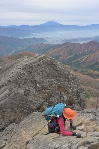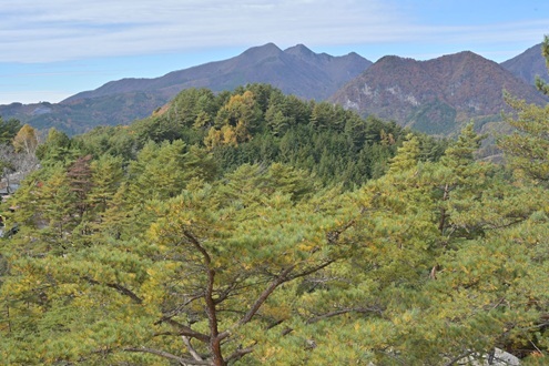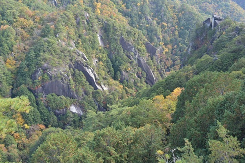 ▼尾根途中から渓谷沿いの屹立する岩群を俯瞰する
