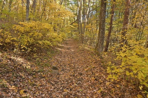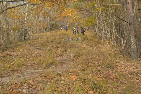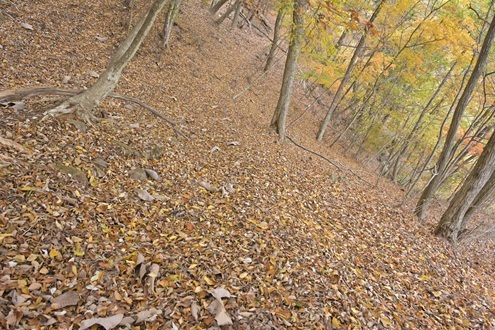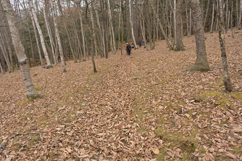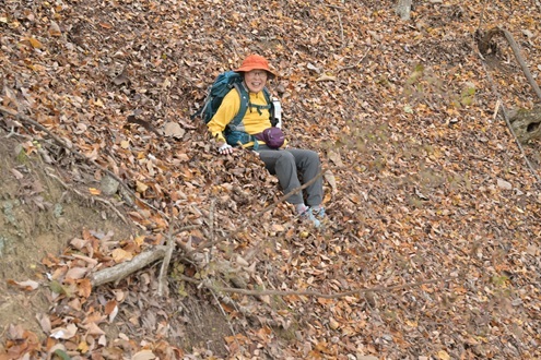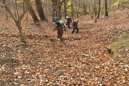 ▼滑りやすい落ち葉の中に隠れた邪魔者を慎重によけながら下る