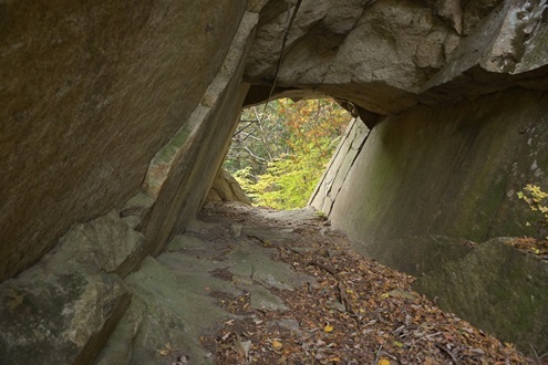 ▼仙娥滝に下り立つ頃岩をくりぬいた通路が現れた