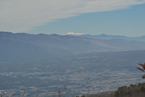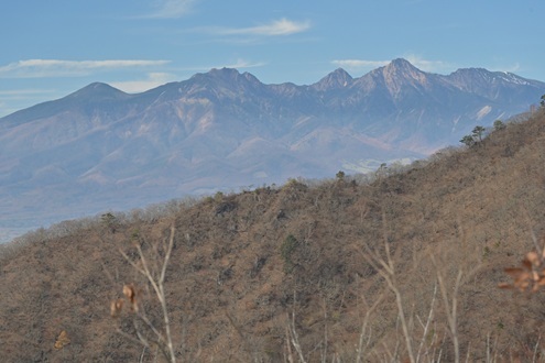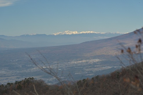 ▼甲府盆地を挟んで目の前に連なるのは甲斐駒と南アルプス連山だ
