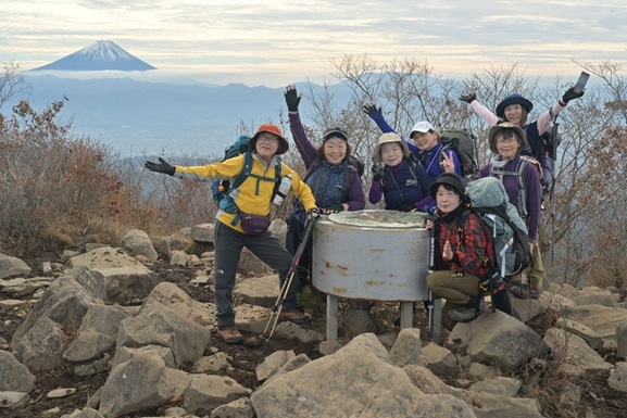 ▼山頂の方位盤を囲んで富士山を背に一枚!!