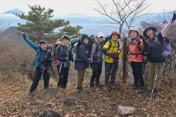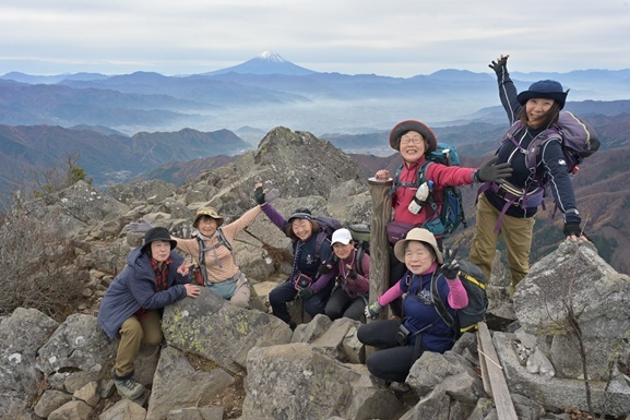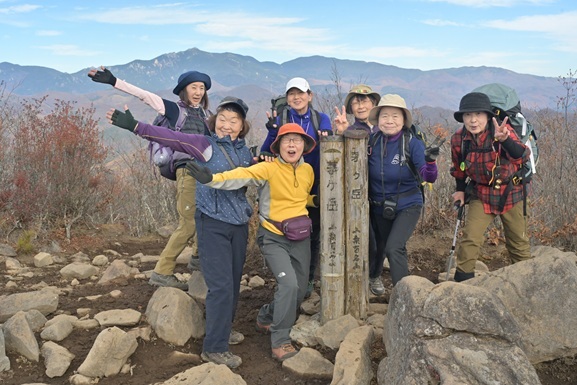 ▼今度は金峰山をバックに茅ヶ岳の山頂標柱を囲んで(^^♪