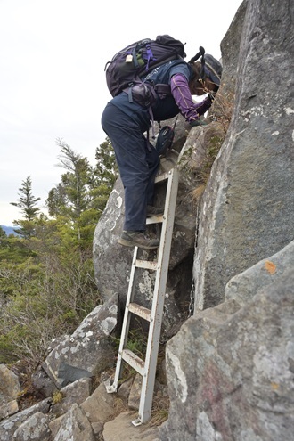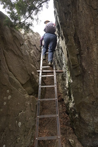 ▼下山は反対側に周り周回路を取るがまずは垂直近い短い鉄バシゴだ