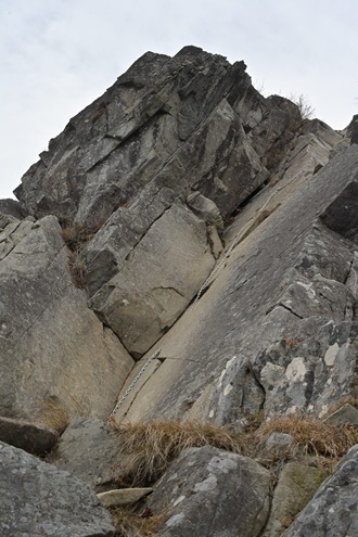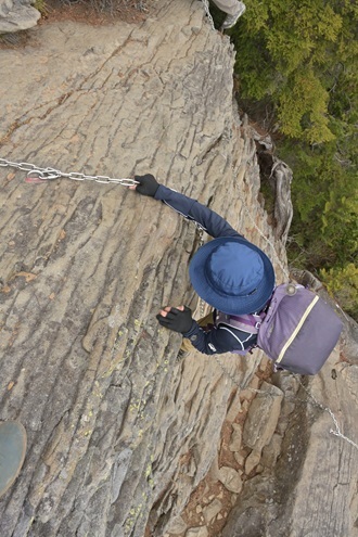 ▼ほぼ垂直の岩場をクサリのみで登る個所もある