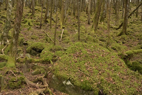 ▼急坂を転げ落ちるように下降して緩やかになると苔むす林が現れる