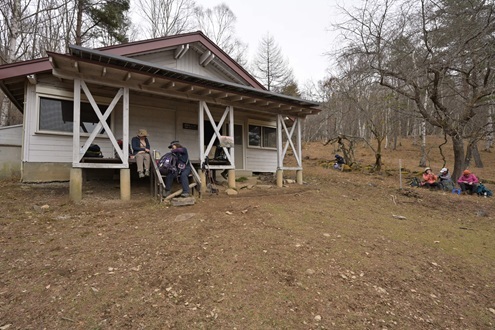 ▼国師ヶ原に立つ無人避難小屋の高原ヒュッテにてランチタイムとした