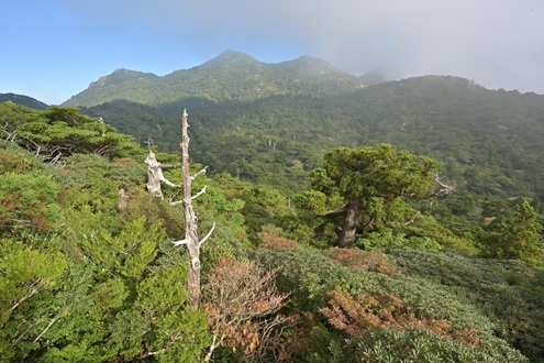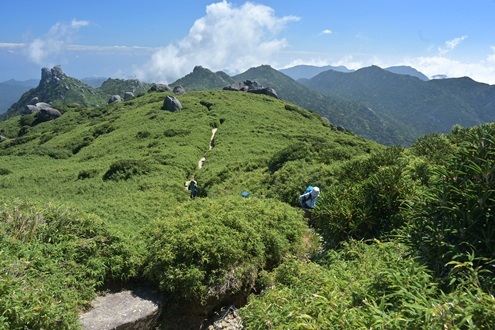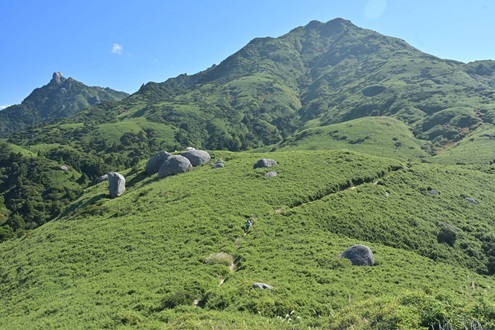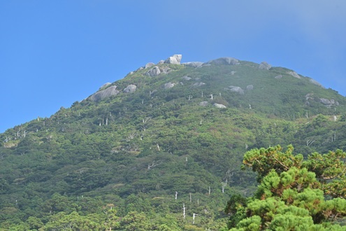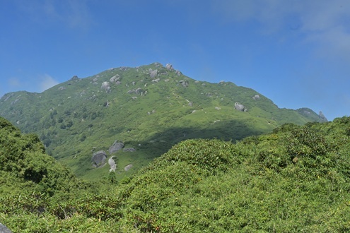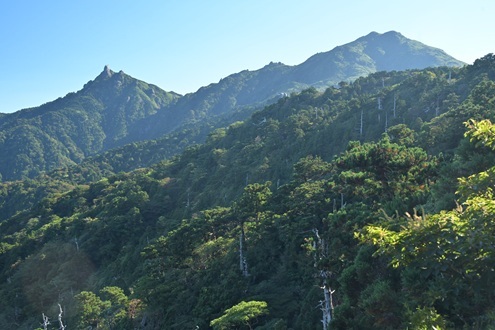 ▼安房岳裾付近から見上げた栗生岳とその背後の宮之浦岳方面