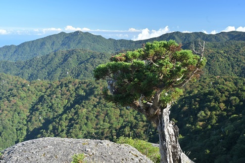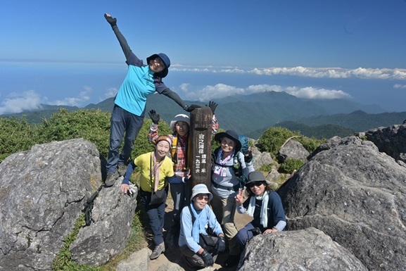 ▼ひと月35日雨が降るといわれる屋久島の宮之浦岳の山頂でこの快晴、最高だなぁ~