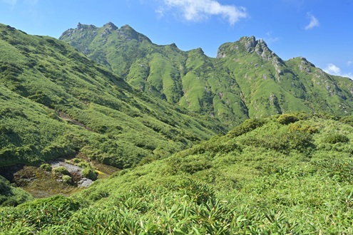 ▼展望地から眺めた黒味岳と筑紫岳岳(投石岳)方面