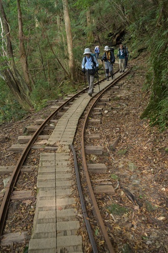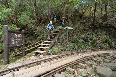 ▼山道から緩やかな森林軌道の鉄路後へと降り立つ