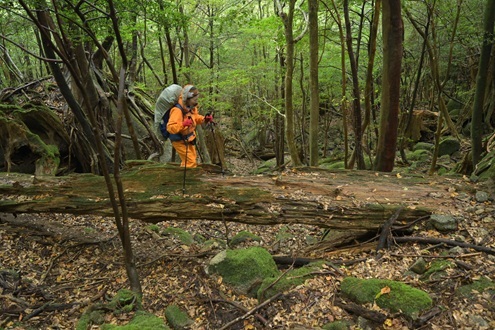 ▼伐採した杉を運び出すために敷かれた森林鉄道作業道を緩やかに下降してゆく