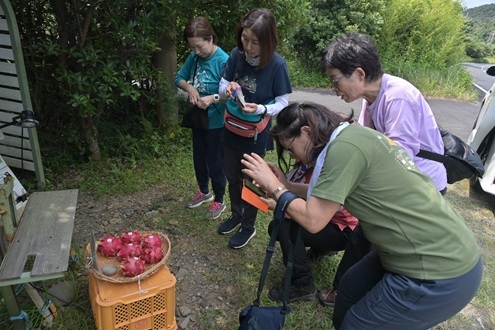 ▼道端の無人販売所に置かれたドラゴンフルーツにみんな興味津々
