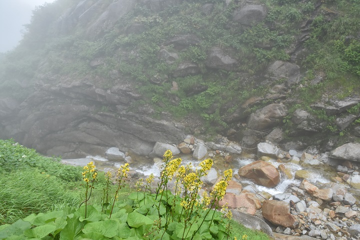 ▼4日目はオタカラコウ咲く沢沿いに仙人谷を下降して行く