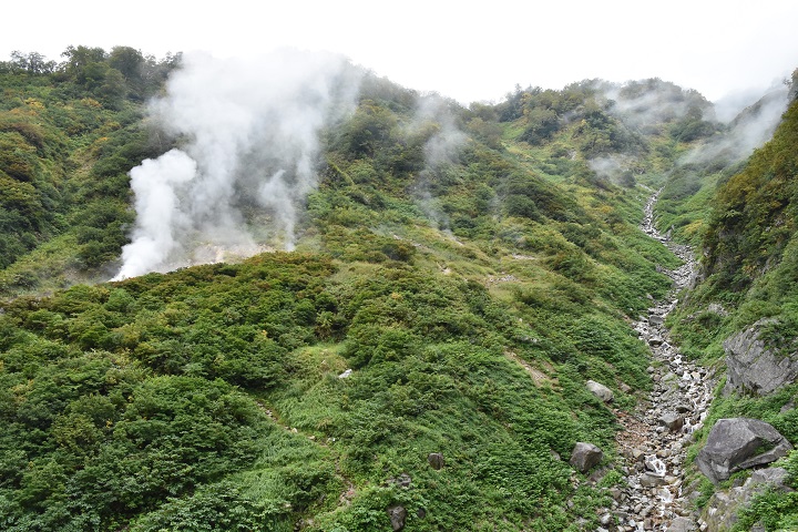 (右)もうもうと白湯気を上げる仙人温泉の湯元