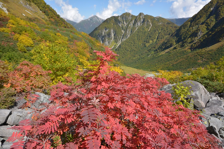 ▼涸沢カールの色ずくナナカマド越しに見る涸沢岳