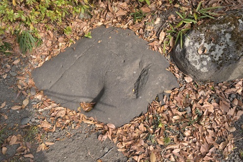 ▼百合若大臣の足痕石と呼ばれている百合若大臣が踏ん張るために足を置いた石