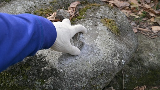 ▼刎石岩の裂け目から水蒸気で湿った風が出ている風穴