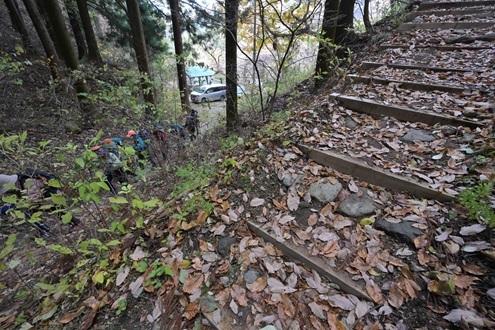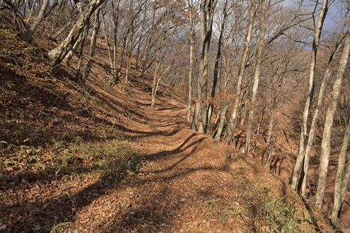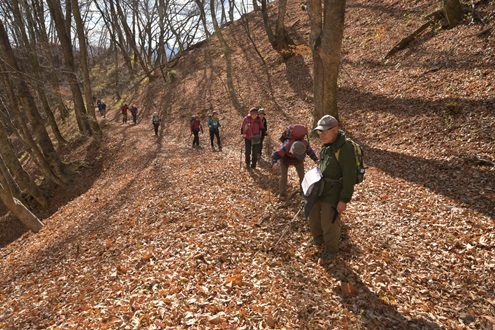 ▼滑りやすい落ち葉の中に隠れた邪魔者を慎重によけながら下る