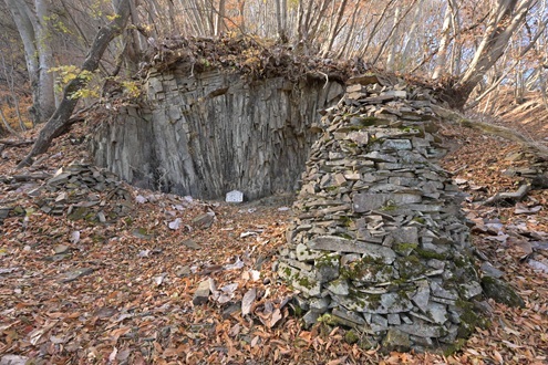 ▼急な坂道途中の柱状節理とその石を積み上げたケルン