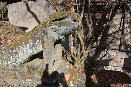 ▼神社入口には二体の何とも不思議な形の狛犬が祀られていた