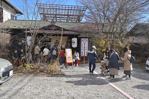 ▼平日なのに門前のだんご屋はたいそう繁盛していた、さすがは軽井沢