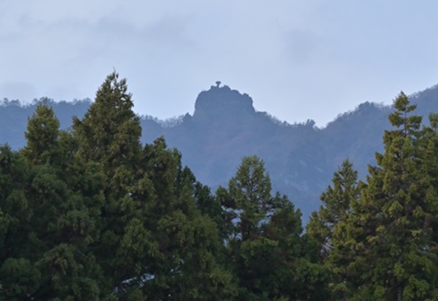 ▼街道から裏妙義とそのシンボルの丁須の頭通称ハンマーヘッドを見上げる