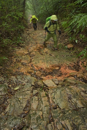 ▼足元の岩は雨に削がれた硬い石灰岩で靴さえ切れるのではないかと思った((+_+))