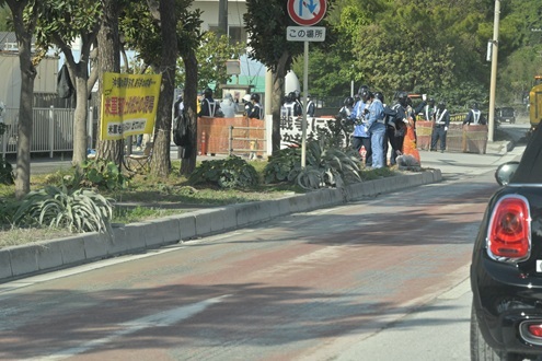 ▼次の登山口に向かう途中に国道上で見た基地問題の最前線