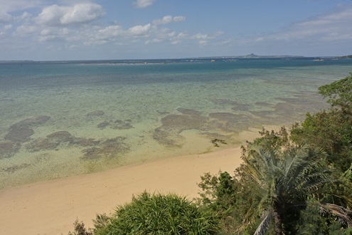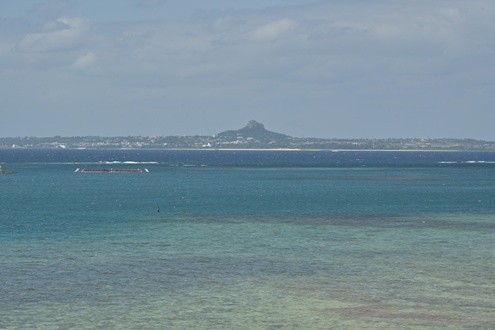 ▼サンゴ礁の海岸と沖縄ブルーの海の先にあるには伊江島で高いのが城山、来年はここか