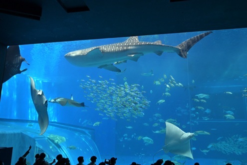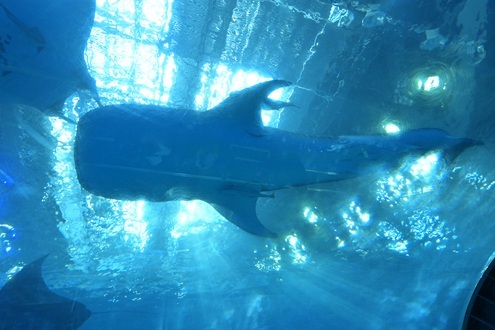 ▼大きな水族館が実感できるのはジンベイザメが頭上を泳ぐ姿だった