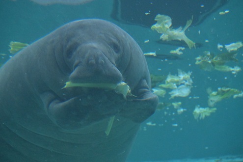 ▼器用にひれで野菜を食べるジュゴン(*_*)